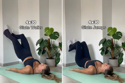 Aquí al ejercicio de fuerza le añadimos un toque de cardio. Desde la posición de puente, hacemos pequeños impulsos o saltos con el cuerpo, empujando ambos pies contra la pared. Se trata de un movimiento explosivo pero controlado, que activa las fibras musculares de forma más intensa para trabajar dicha zona el doble.