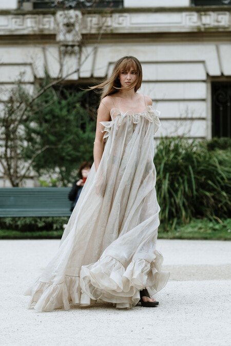 Este diseño encabeza la lista porque tiene toda la esencia de Sienna Miller, la musa por excelencia del boho-chic. Su tejido en tul transparente, las mangas con frunces estratégicos, el escote en V con detalle plisado y el acabado asimétrico lo convierten en un firme candidato. Además, en lugar de apostar por el típico rosa empolvado, el color salvia es el protagonista de esta joya etérea y me encanta. Está en Zara por 79,95 euros.
