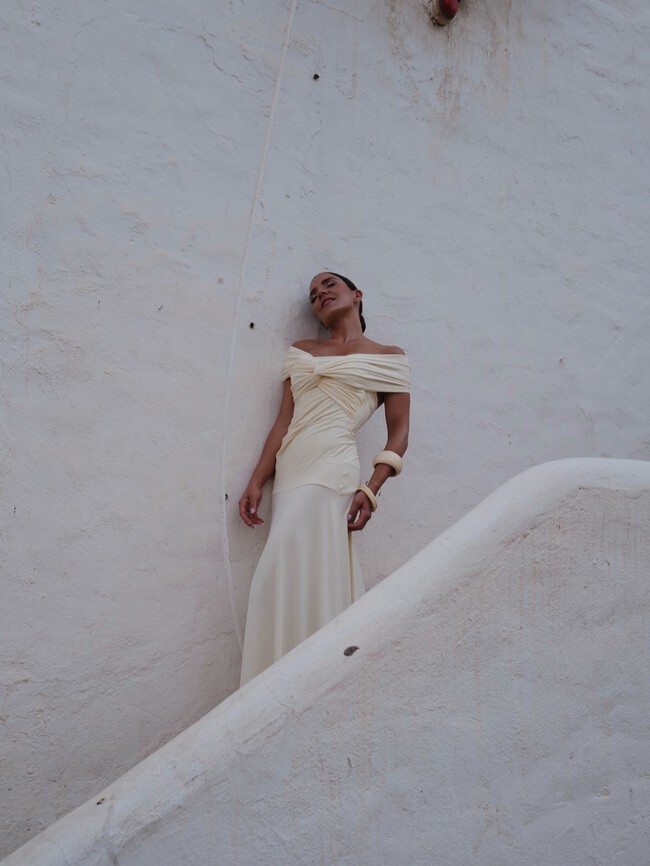 Un diseño minimalista con un detalle fruncido que hace tipazo. El corte es entallado con una falda de vuelo que queda genial. Tiene escote halter y mangas a la sisa. Está hecho con un tejido de algodón elástico y otra de las virtudes que tiene es su versatilidad, ya que podemos combinarlos de diferentes formas.
