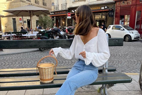 Si queremos combinar este clásico con vaqueros pero no quedarnos en lo de siempre, podemos salir de nuestra zona de confort con este estilismo súper boho y original. Se trata de un look a base de prendas clásicas como la chaqueta azul marino -uno de los colores del año que va de perlas con el marrón de nuestras alpargatas-, la camisa de rayas y un pantalón holgado recto.