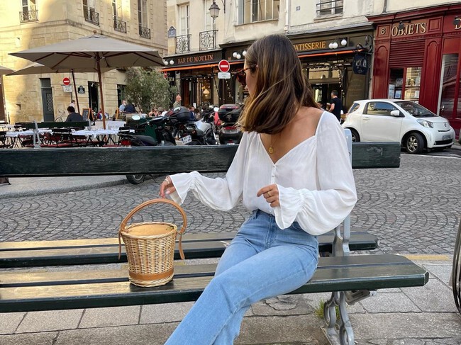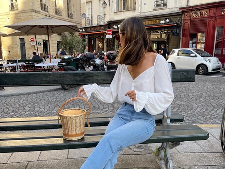 Si queremos combinar este clásico con vaqueros pero no quedarnos en lo de siempre, podemos salir de nuestra zona de confort con este estilismo súper boho y original. Se trata de un look a base de prendas clásicas como la chaqueta azul marino -uno de los colores del año que va de perlas con el marrón de nuestras alpargatas-, la camisa de rayas y un pantalón holgado recto.