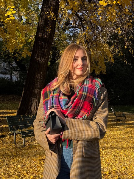 La combinación de azul marino y marrón chocolate es un must. Así que las zapatillas Adidas quedarán genial con esta propuesta de la influencer Hollie Mercedes. Un outfit formado por unos vaqueros atemporales y una chaqueta para tendencia. El bolso shopper efecto ante añade un aspecto lujoso y queda genial con la bufanda del mismo tono.