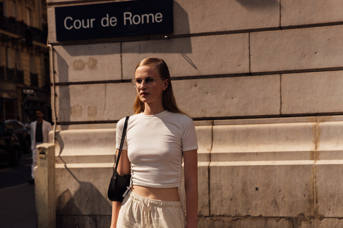 Las faldas largas siempre elevan cualquier look de verano. La influencer Erea Louro en este outfit la combina con un top básico en color blanco y unas zapatillas plateadas similares a las Converse. Para completar el conjunto, opta por un bolso de Prada que añade un aspecto lujoso, sin restas sencillez.
