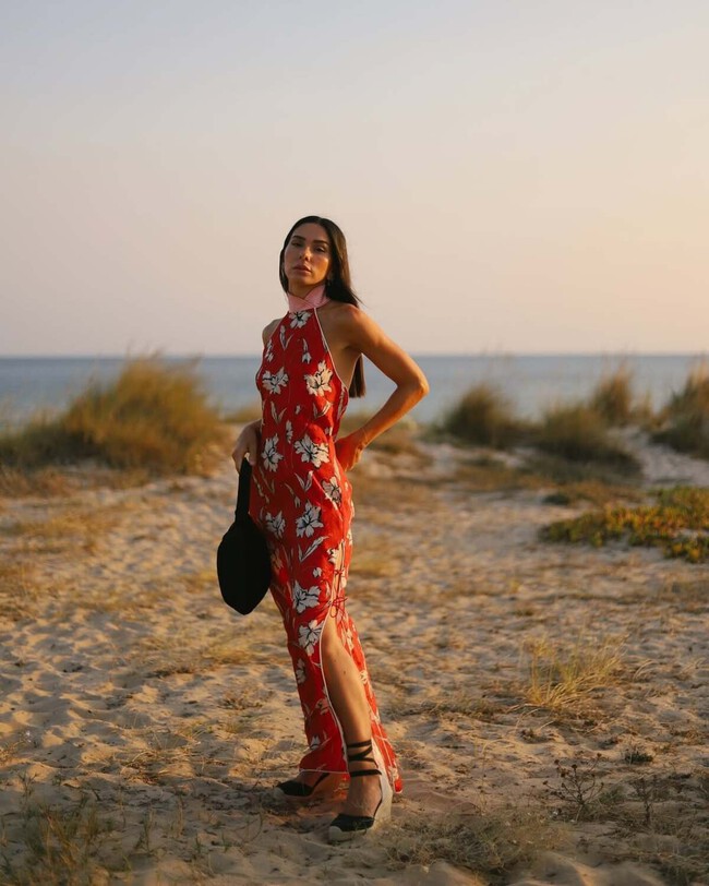 - Bolso Olivia Mareque: El punto focal del look se lo lleva este complemento plateado con una correa en forma de nudo naranja. Dos colores que se complementan y forman un bonito binomio. Un shopper sencillo que se adapta a cualquier ocasión y, podemos incluir en los outfits de noche bajo el brazo. El precio en El Corte Inglés es 135 euros.