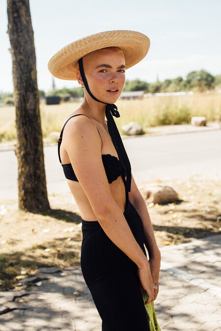 El pañuelo en la cabeza le da un toque trendy al conjunto, pero con las altas temperaturas que estamos teniendo y para protegernos mejor del sol, nosotras lo cambiaríamos quizás por un sombrero estampado.