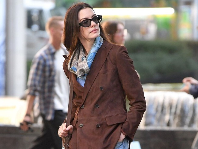 Una de las imágenes que se ha filtrado es de Anne Hathaway -en adelante Andy- con un look casual ideal compuesto por jeans, botines animal print, chaqueta de ante marrón y pañuelo estampado al cuello. Un estilismo muy fácil de copiar que incluye un accesorio de lujo que tiene todas las papeletas para ser viral (y copiado) hasta la saciedad este 2026.