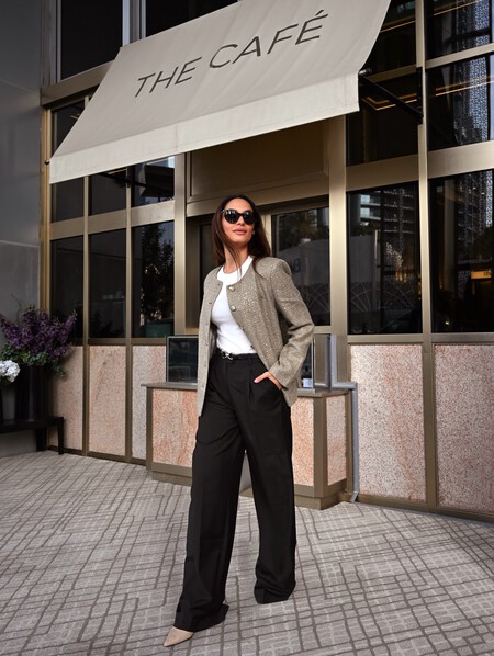Esta propuesta de la influencer María Tilve es muy sencilla y su look está formado por varias capas, creando un efecto layering. Unos pantalones beige, una camisa azul de rayas, un jersey gris y un bolso muy similar al de Tous. Un outfit que podemos completar con un abrigo largo en tono azabache que lo elevará.