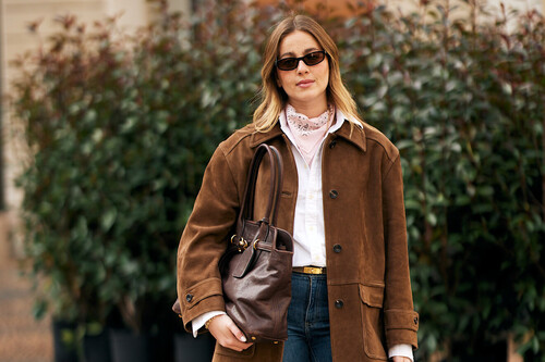 Las más pragmáticas seguro que se sienten más alineadas con este look parisino formado por chaqueta de ante oversize y pantalón ancho en color gris de estilo sastre. El maxi bolso tipo shopper potencia el carácter práctico de este look que además de elegante, tiene pinta de ser muy cómodo (sobre todo si añadimos unas zapatillas de tendencia a la ecuación).