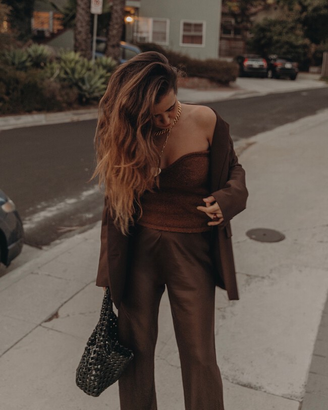 Esta propuesta de la influencer Gabriele Gzimailaite es muy elegante y arrasará tanto de día como de noche. Los mocasines de Gioseppo son un buen ejemplo para combinarlo. Un look formado por un vestido efecto americana oversize. Este es de color dorado, el favorito para la Navidad.