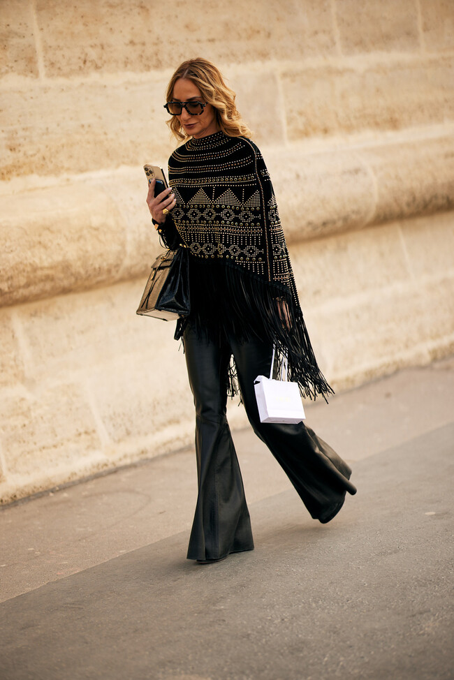En el street style encontramos inspiración de todo tipo para aplicar esta tendencia tan maximalista -lo que confirma que está de moda- y una de ellas es tan cool como gustosa. Basta con combinar nuestro pantalón de campana negro con un jersey oversize en color gris: un binomio que nunca falla pero que se adapta a lo que marca la moda en 2025.