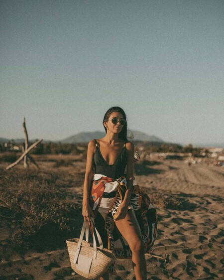 Si queremos darle un giro más vacacional, el pareo largo con detalles vibrantes es la mejor opción. Este podemos llevarlo como una falda o un vestido anudado al cuello. La elegancia del traje de baño negro es ideal para combinar con un kaftan o, en una línea de street style, con unas bermudas vaqueras, con las que podamos salir al mercado antes de bajar a la playa.