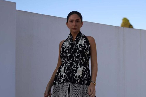 En esta propuesta, el top gana mucha importancia. Tiene un diseño de flecos y bordados en tono negro súper elegante ideal para ocasiones más formales como puede ser una cena o, simplemente, un evento de día. El pantalón es un clásico que complementa a la perfección cualquier outfit y las sandalias atemporales la mejor elección. Para elevar el conjunto, una cartera dorada sería la clave.