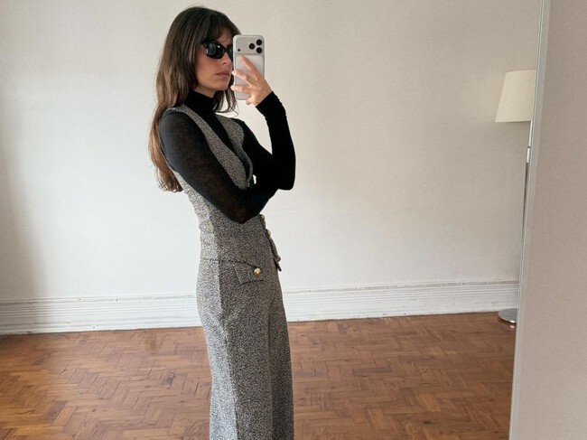 Pero el que realmente parece de sastre a pesar de su tejido es este traje de punto con chaleco de mezclilla y pantalón wide leg. Un dos piezas de punto que va de perlas con un jersey negro de cuello cisne en invierno y una camisa blanca en primavera. Di-vi-no y elegante.