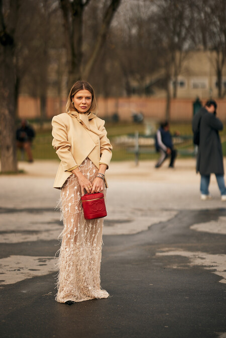En esta propuesta del street style de París, tenemos un maxi vestido en tono beige con detalles muy elegantes combinado con una chaqueta con una lazada al cuello en tendencia. Para darle un toque de color, opta por un bolso de mano rojo que destaque y hace match con estas sandalias de Clarks que sumarían altura a la prenda (para que así no arrastre).