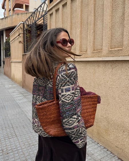 El bolso, aunque da un aspecto artesanal, lo cambiaría por una opción de nailon que sea más resistente a cualquier temporal. Tanto Parfois como Bimba y Lola tienen modelos que se ajustan a nuestras necesidades. Para los accesorios, si queremos seguir la línea atemporal, un pañuelo estampado sería increíble.