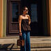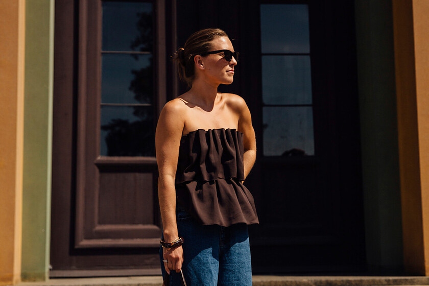 En esta propuesta de street style, vemos un look casual formado por unos vaqueros de corte recto con un top palabra de honor súper tendencia en tono marrón chocolate. Aunque las sandalias son planas, estas cuñas quedarían mucho mejor y le darían unos centímetros a los pantalones para que no arrastren.