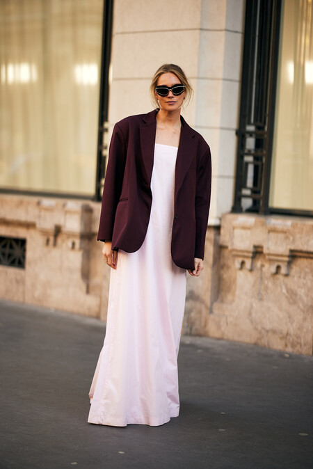He fichado la combinación perfecta para llevar estas cuñas de Skechers. Se trata de una propuesta del street style de París formada por un maxi vestido en tono rosa bebé -casi blanco- y una americana oversize con hombreras. Un look que respira elegancia y que nos convertirá en la más estilosa de la oficina en verano. De hecho, sin la blazer también tendríamos un auténtico outfit que podemos combinar con un capazo de rafia y unas gafas de sol ideales para protegernos del sol con mucho glamour.