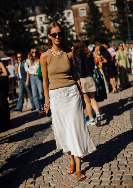 Una falda globo blanca, una americana marrón chocolate y shopper clásico que aporte seriedad al conjunto son los elementos clave para llevar a la ciudad las sandalias de trekking. La formalidad de todas las prendas y su carácter básico ayudan a equilibrar el estilismo y el resultado nos convence. No le ponemos ni un solo pero y solo cambiaríamos la falda blanca por un vestido amarillo mantequilla (por apuntarnos a otra tendencia de la temporada).