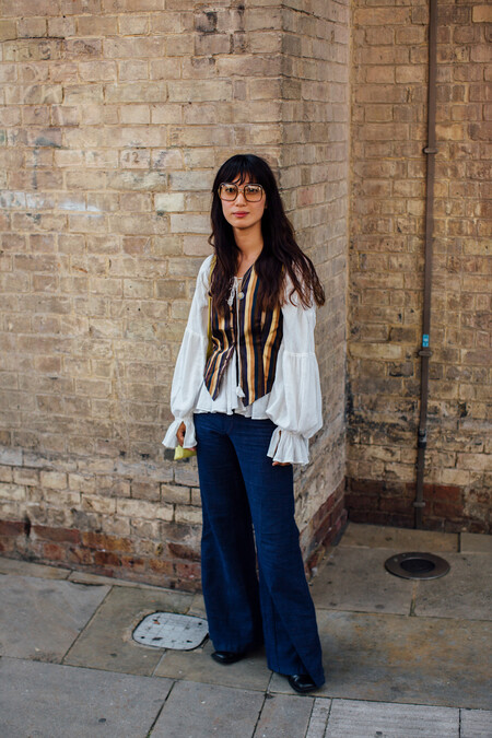 Los aliados naturales de esta blusa de estilo setentero son sin duda los vaqueros wide leg. Estos de H&M con mini bolsillos frontales son perfectos porque le aportan esa literalidad retro al conjunto. Además, tienen un precio tan cómodo de llevar como su silueta por 29,99 euros.