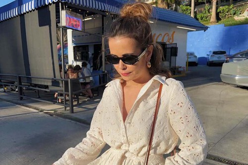 En esta propuesta de la influencer Sara Escudero, el vestido blanco camisero con bordados ingleses es el protagonista. En esta ocasión, lo ha combinado con un capazo. Nosotras añadimos las Converse que marcarán un antes y un después en el look. Además, las gafas de sol son un elemento que aportan un toque actual. Un conjunto perfecto para disfrutar de una comida informal con amigas.