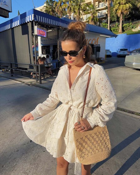 En esta propuesta de la influencer Sara Escudero, el vestido blanco camisero con bordados ingleses es el protagonista. En esta ocasión, lo ha combinado con un capazo. Nosotras añadimos las Converse que marcarán un antes y un después en el look. Además, las gafas de sol son un elemento que aportan un toque actual. Un conjunto perfecto para disfrutar de una comida informal con amigas.