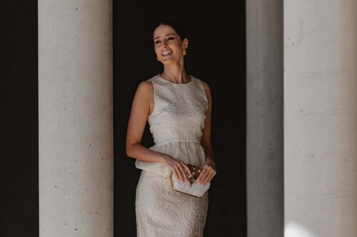 En esta propuesta de la influencer Sandra Majada, el clutch de nácar similar al de Sfera lo combina con un vestido de corte midi en tono crudo y unas sandalias con tacón de tiras doradas. Una opción veraniega muy sofisticada súper acertada para una boda de tarde. Si queremos darle un toque más actual y flamenco, un mantón bordado es una gran elección.
