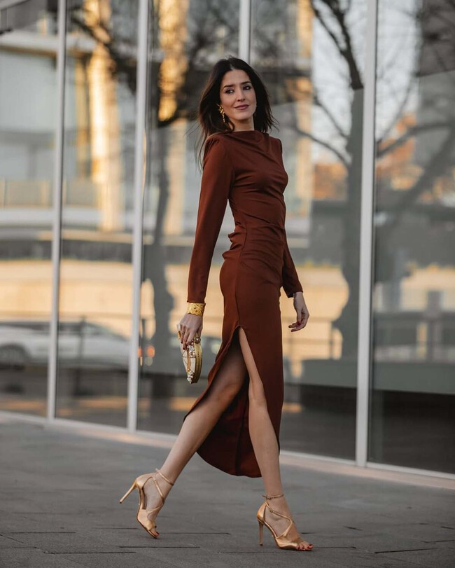 En esta propuesta, encontramos un vestido muy similar, combinado con sandalias doradas y una cartera a juego. Sin embargo, para darle un aire más vibrante y juvenil, apostaría por unas sandalias en un tono llamativo, como el naranja, que aportarían frescura y personalidad al look. Así, no solo tendríamos un outfit ideal para una boda de tarde, sino también una opción sofisticada y con mucho estilo para una madre de comunión que quiera destacar sin renunciar a la elegancia.