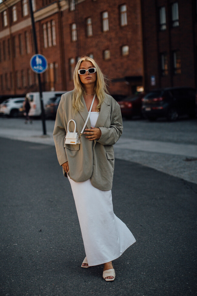 Una falda blanca y una blazer gris son perfectas y dos básicos de fondo de armario que siempre añaden un toque de elegancia a cualquier outfit. Además, si lo combinamos con un bolso de lujo o que parezca tendremos un estilismo digno de un sobresaliente. En esta propuesta del street style de Helsinki combina unas sandalias similares con el Chiquito de Jacquemus.