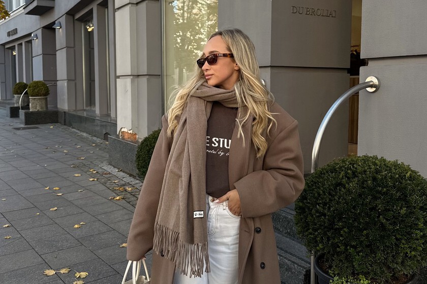 Para el bolso, una bandolera en tono marrón chocolate es un acierto y hará match con el resto del look. En cuanto a las joyas, un collar XXL es ideal para aportar un toque original y llamativo. Los días más fríos podemos sustituir la chaqueta por un abrigo acolchado.