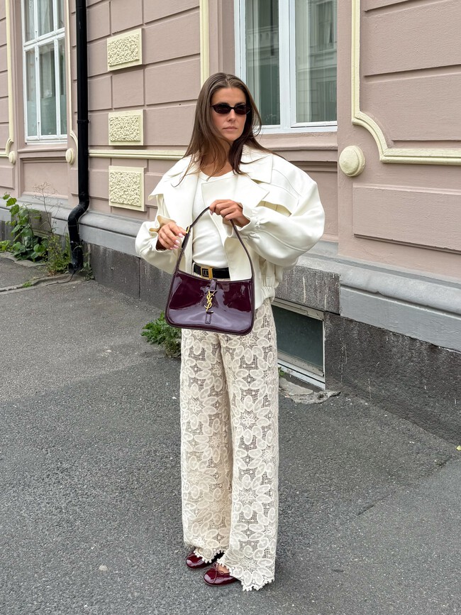 Esta propuesta de la influencer Chiara Ferragni es un acierto para resolver cualquier look diario. Es muy fácil de copiar y en nuestros básicos del fondo de armario encontraremos prendas similares. La blazer eleva el outfit y los zapatos de Skechers quedan genial haciendo match con el bolso burdeos.