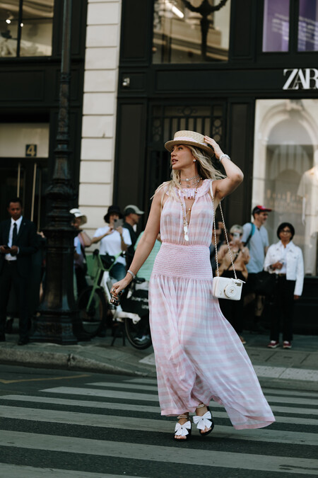 Los tonos pasteles son nuestros mejores aliados durante el verano. En este look del street style de París, fichamos unas sandalias similares a las de Massimo Dutti combinadas con una falda larga de tweed y un tank top. Un outfit sencillo y llamativo por el mini bolso que cuelga del cinturón que le da rollazo.