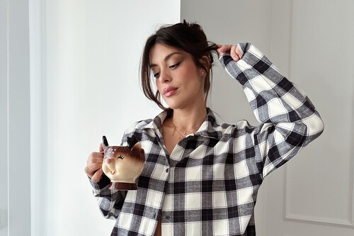 Para elevar el look cuando estemos en casa y combinar las zapatillas de H&M, este pijama es la mejor opción. Hace match con ellas y todo el conjunto es marrón, uno de los tonos tendencias de la temporada. Parece muy cómodo y está hecho en satén, un tejido muy delicado. Tiene un diseño muy elegante y está disponible también en azul pavo. El precio del pantalón en la web de Mango es 22,99 euros (antes 39,99 euros) y de la camisa es 22,99 euros (antes 39,99 euros).