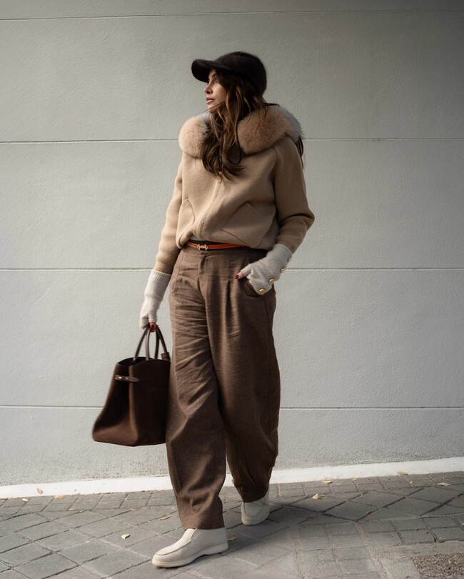 Para completar el conjunto, el bolso shopper a juego con el abrigo es un must que suma mucho glamour. Si queremos elevar el look, un gorro de pelo es un acierto y quedará en armonía con el resto del outfit.