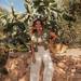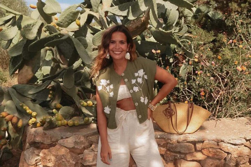 En esta propuesta de primavera-verano, el chaleco bordado cuenta con mucho protagonismo y le da un toque vibrante al look. Además, las sandalias trenzadas en tono beige y los pantalones de lino blanco junto al capazo de Loewe crean un outfit muy equilibrado y un básico para ir a la playa con mucho estilo o, simplemente, disfrutar de una comida informal con amigas.
