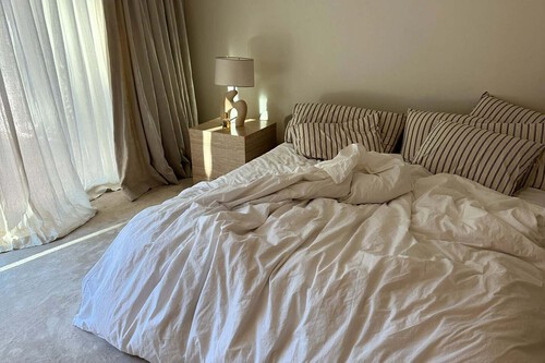 La ropa de cama en tono claro siempre añadirá luminosidad a cualquier habitación. Está hecha de algodón y parece muy cómoda, siendo ideal para dormir toda la noche plácidamente. Es una excelente opción para acomodar tanto en dormitorios pequeños como otros más grandes.