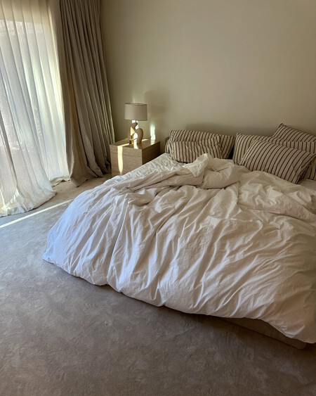 La ropa de cama en tono claro siempre añadirá luminosidad a cualquier habitación. Está hecha de algodón y parece muy cómoda, siendo ideal para dormir toda la noche plácidamente. Es una excelente opción para acomodar tanto en dormitorios pequeños como otros más grandes.
