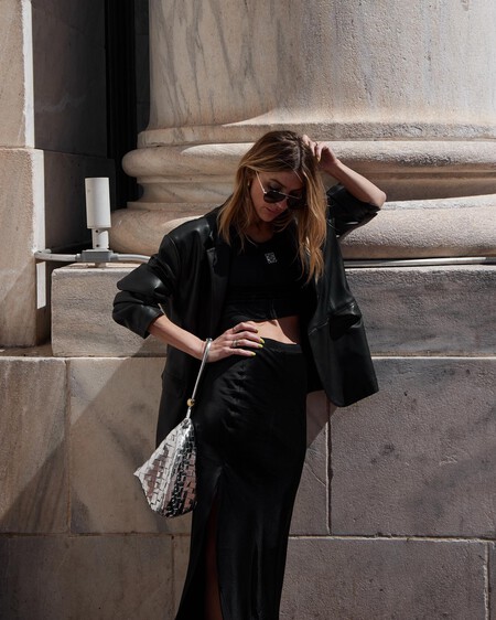 Se trata de una falda en color negro -también disponible en marfil- que tiene el detalle del encaje en la parte inferior. Su corte es midi y cuenta con una cintura elástica que se ajusta a la perfección a nuestro cuerpo sin que nos sintamos incómodas al llevarla. Está hecha con un tejido satinado y combinada con un top del mismo color puede tener vibes de vestido.