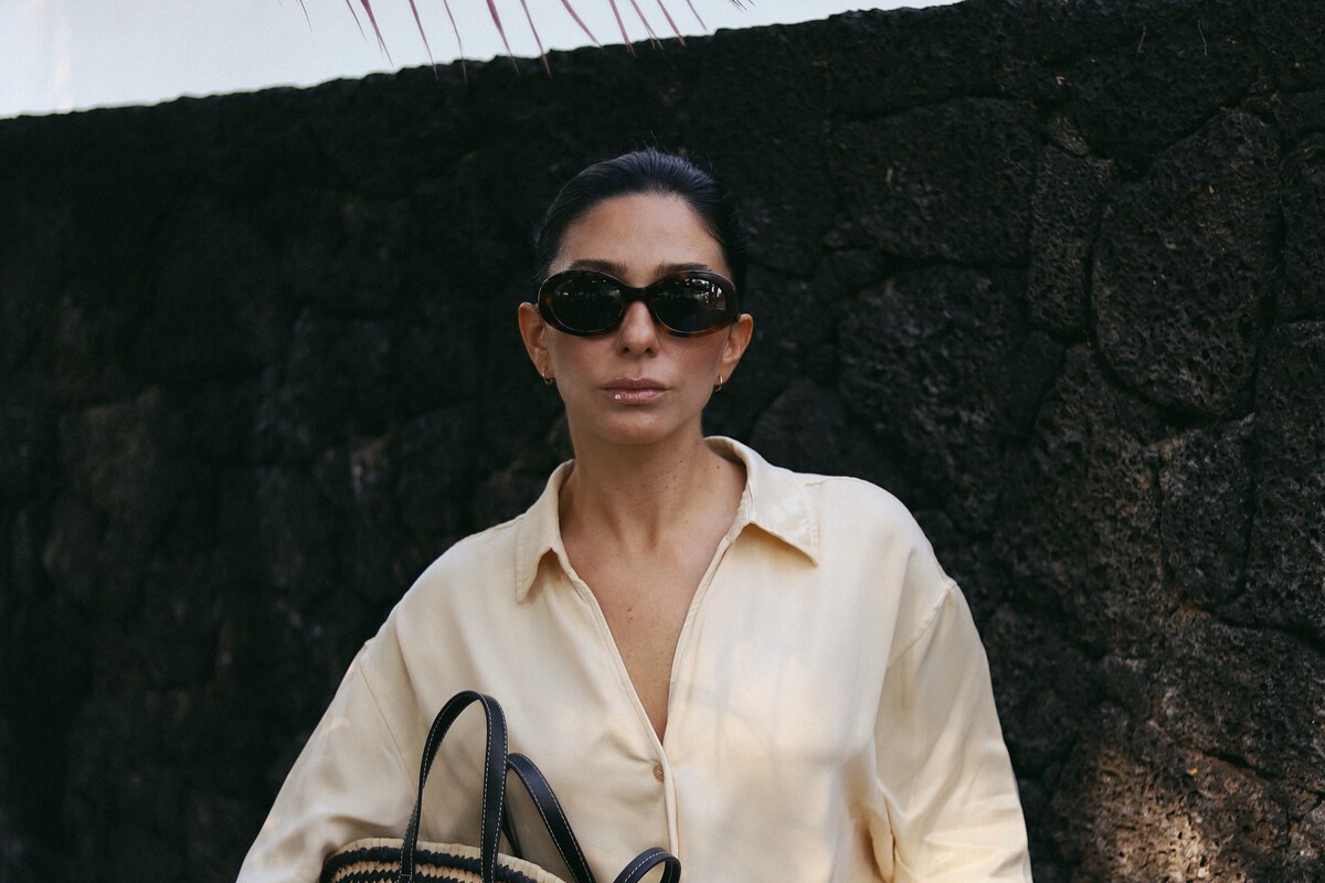Para completar el outfit, el pañuelo en tono rojo es un acierto que eleva el look. Los bolsos trenzados vuelven y este modelo en color azabache es ideal y hace un buen contraste con el resto de prendas.