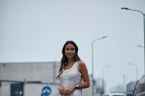 Gracias a la versatilidad del vestido de Lefties podemos hacer varias combinaciones, desde las más formales hasta las que tienen un estilo relajado y casual. En esta propuesta del street style de Nueva York, encontramos una prenda similar llevada con un capazo XXL y unas zapatillas tipo Barefoot.