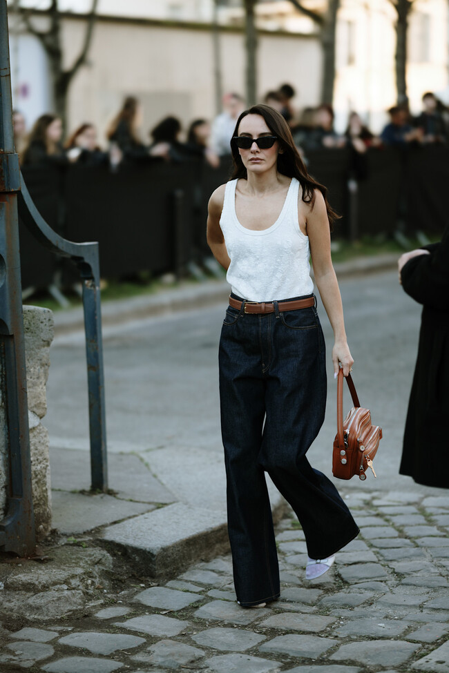 Para combinar los vaqueros con estilo, la opción más acertada es una camiseta y varios accesorios que eleven el look. En cuanto a los zapatos, si nos inspiramos en este outfit del street style de París, unas zapatillas quedan genial y son muy cómodas.