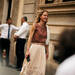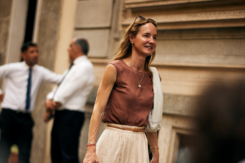 En esta propuesta del street style de Milán fichado este look tan sencillo para ir a la oficina en verano cualquier día de la semana. Está formado por una falda corta negra y una camisa con detalle cropped que añade un toque muy cool al outfit. Las sandalias tipo alpargatas de Lidl quedarían genial, creando un conjunto en equilibrio.