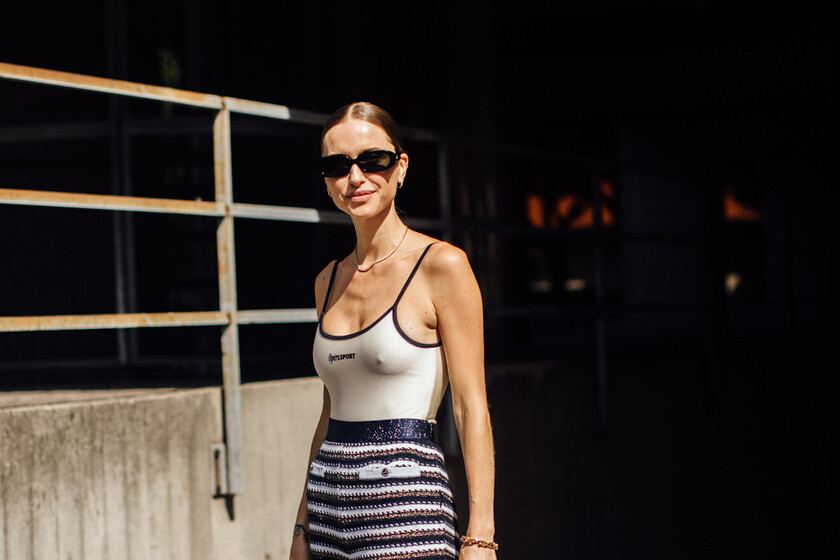 Combinar unas sandalias blancas o negras resulta muy fácil, pero cuando entran en juego unas en tono azul cielo no lo tenemos tan claro. En esta propuesta veraniega, los pantalones de punto son una opción acertada para cualquier día de la semana. Además, al ser tan versátiles podremos llevarlos con un body efecto bañador (para ir al chiringuito o, simplemente, dar un paseo fresquitas) o con un top de punto similar para crear un outfit más equilibrado y casual ideal para ir al mercado o a tomar un aperitivo con amigas.