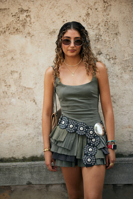 Las sandalias tipo Birkenstock tienen una estética minimalista que queda bien con cualquier conjunto. Un ejemplo es este look del street style de Milán, formado por una falda corta con estampado de flores y volantes y una blusa blanca que añade un toque romántico al outfit.
