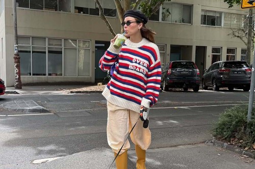 Si tu armario está lleno de color, quizás encuentres prendas más acordes con esta propuesta. Un jersey oversize de rayas, unos pantalones de un tejido similar al lino, metidos por dentro al estilo bombacho, que aportan mucho estilo al outfit, y un par de botas amarillas. Para elevarlo, la boina suaviza el conjunto, dándole un toque más parisino, mientras que el bolso, que seguro lleva, es de tono azul, simplemente para aportar un contraste bonito y discreto.
