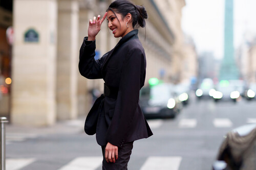 Combinar una chaqueta negra con estilo puede ser complicado, pero en el street style de París he fichado un ejemplo sencillo ideal para inspirarnos cuando llegue el momento de ir a la oficina en otoño. Se trata de un look formado por un pantalón híper cómodo y un top gris que aporta luz a este outfit de día. La prenda de Mango quedaría genial y agregaría un aspecto lujoso.