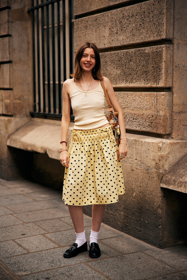 En esta propuesta del street style de París el look está formado por un conjunto beige con chaqueta oversize y falda a juego. Una opción perfecta para ir al trabajo combinado con las alpargatas rosas. Un outfit sencillo que podemos reutilizar cada día de la semana por separado, llevando la chaqueta con unos vaqueros o la falda con una blusa cropped.