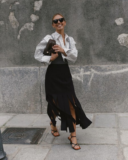 Es una gran alternativa a la negra atemporal. Para completar el look con glamour, podemos optar por unas bailarinas rojas haciendo un bonito contraste y una blusa blanca o un top y unas zapatillas en un outfit más informal. El precio en la web oficial de Massimo Dutti es 79,95 euros.