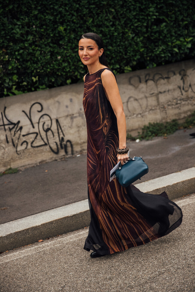 El marrón chocolate y el negro hacen match y la prueba la tenemos en el este look de Lucía Barcena. Un vestido similar al de Massimo Dutti combinado con una cartera negra y blanca y unas sandalias con taconcito. Un outfit muy sencillo y acertado para cenar en un restaurante cualquier noche de verano.