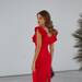 Este vestido en tono rojo es una pieza diseñada para dejar huella en cualquier celebración. Su diseño destaca por el escote Bardot drapeado que deja los hombros al descubierto. Crea un juego con los volúmenes y las líneas, aportando una estructura de alta costura. Está hecho de tul y queda entallado. La falda es de corte maxi y parte desde el bajo de las caderas. El precio en la web oficial de El Corte Inglés es 179,99 euros.