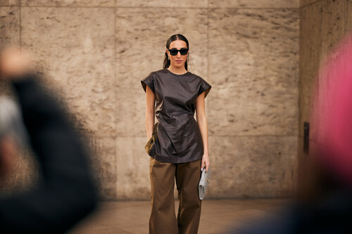 Me encanta jugar con los colores en los looks de verano. En esta propuesta del street style de París, los tonos marrones son los protagonistas del outfit. Un top combinado con unos pantalones acampanados que hacen match con un bolso plateado que proporciona un toque de luz al conjunto. Para completar el estilismo, las sandalias amarillas serían perfectas porque sumarían centímetros y, además, darían un aspecto divertido.
